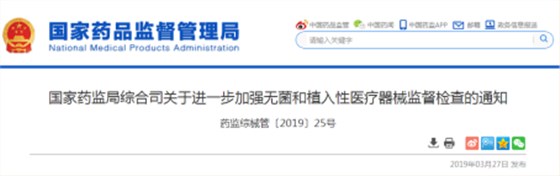 3月27日,國家藥品監督管理局發布《國家藥監局綜合司關于進一步加強無菌和植入性醫療器械監督檢查的通知》(藥監綜械管〔2019〕25號),要求各省級藥監進一步加強無菌和植入性醫療器械監督檢查。
