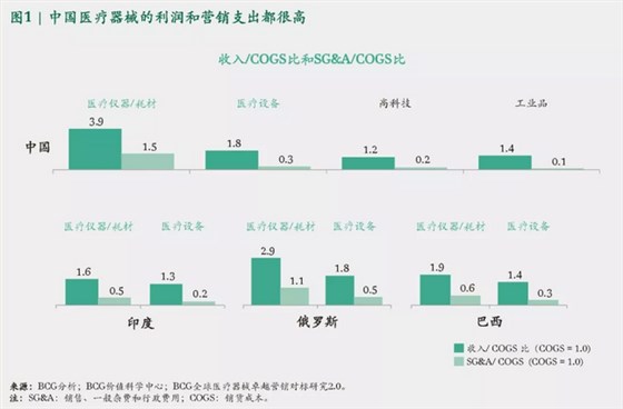根據BCG2015年的數據,中國醫療儀器/耗材公司的平均銷售、綜合和管理費用(SG&A,主要為營銷支出,以銷貨成本的百分比計)超過典型工業品公司的15倍。雖然醫療器械行業正面臨價格下行的壓力和采購流程急劇變化的威脅,但各項成本卻是居高不下。
