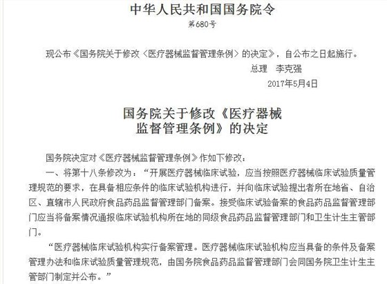 2017年5月4日國務院公布了最新《醫療器械監督管理條例》,相較之前條例,主要做了四大調整